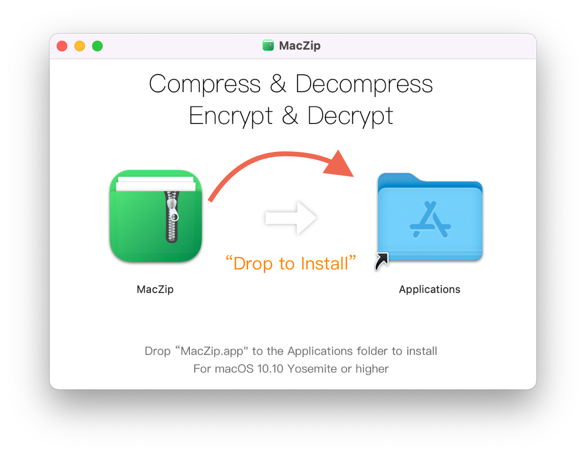 And drag & drop “MacZip” to “Applications”, that's done.