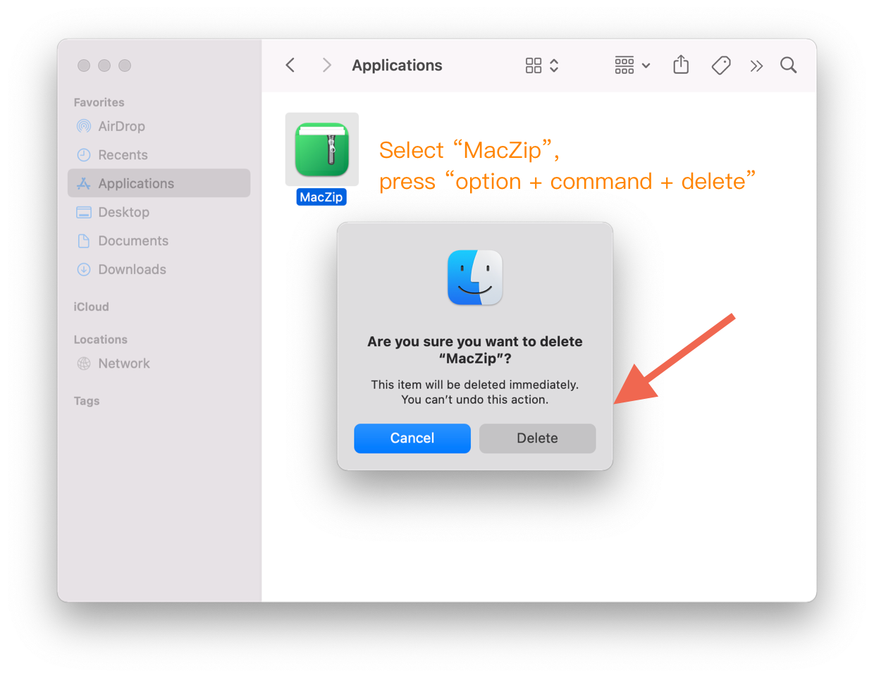 Click the “Delete” button to uninstall “MacZip”.