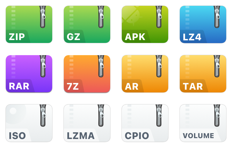 zip, rar, 7z, gz, iso, tgz, lzh, apk, xz, z, bz2, tar, lzma, zst, lz4,